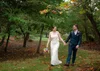 Bride and Groom moments after first kiss as man and wife. Bride is wearing a huge flower crown and the groom is wearing a bright blue suit. The wedding is in Saint Clement’s Church in Seattle Washington.